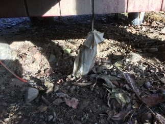 Regelmässig führt eine undichte Stelle irgendwo bei der Stromleitung ins Hühnerhaus zu einem Kurzschluss. Dadurch wird die Strom- und Internetverbindung ins Hühnerhaus unterbrochen. Sollte es demnächst kalt werden, könnte nicht geheizt werden. Die Hühner hätten dann kein Wasser mehr und müssten in Frostnächten frieren. Schon länger zweifelt das Gebäudeunterhaltsteam von «Feng Shui»-Huhn an der Zuverlässigkeit der Steckverbindung direkt beim Hühnerhaus. Diese ist zwar mit Plastik und Kabelbinder vor Nässe geschützt, aber auch sehr der Witterung ausgesetzt (siehe Bild unten).