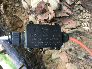 (Hühnerweide, 27.11.2019) Die undichte Stromleitung ins Hühnerhaus führt zu Kurzschluss. Der Stecker muss durch eine wasserdichte Box ersetzt werden.